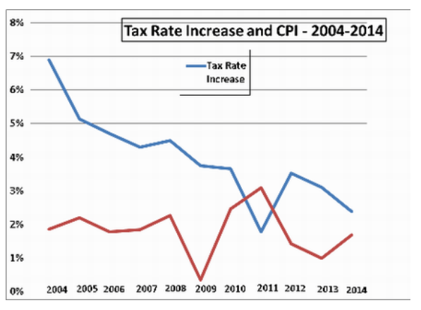 If you look at the first three years, from 2004 to 2006, this is when a majority of council were “tax-cutting” right-wing conservative types, yet the cumulative tax rate was 16.74%, an average of 5.58%/year. For the four years from 2006 until 2010, the cumulative tax rate for Mayor Karen Farbridge and her supposed “tax-and-spend” council colleagues was 16.20%, less than for the three previous years, and the average was 4.05%/year. For the most recent three years, the cumulative tax rate was 10.78%, with an average of 2.695%. Figuratively, here is a visual representation: