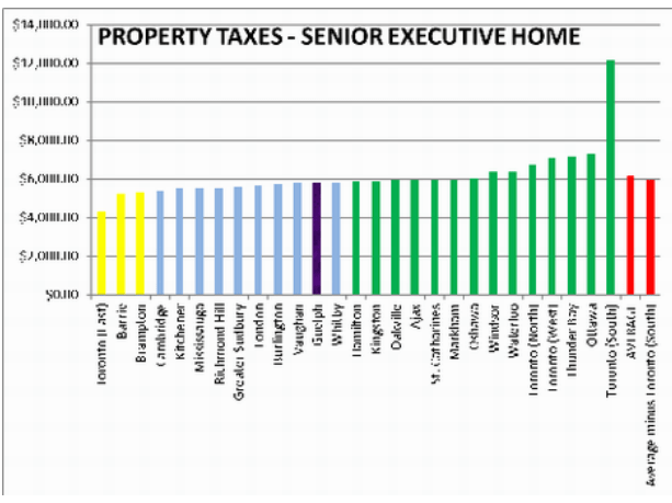 The yellow bars are considered “low-tax-range” cities, the blue are the “mid-tax-range” cities and the green bars are the “high-tax-range” cities. The red bar is the overall average and Guelph is deep purple; note that Guelph is less than the average, and in the mid-range, alongside its neighbouring cities Cambridge, Kitchener and Waterloo. The overblown and deceitful information about Guelph being one of the highest-taxed cities in Ontario is simply nonsense.