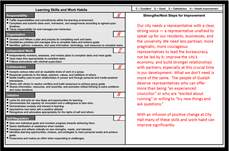 As a parent I am always more concerned with the Learning Skills and Work Habits section of my children’s report cards. With a hat tip to the Ministry of Education’s report card template, here is my assessment of the current council’s skills and work habits.