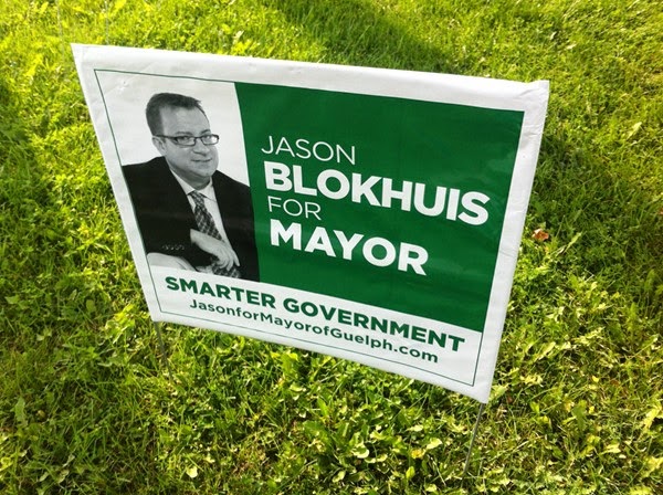 Jason Blokhuis has a tight and segmented sign, but it makes him feel a bit trapped in a box. The juxtaposition between the light and bold typography creates the right emphasis on the message, but the font is a bit trite. Green is a nice colour for Guelph, but placing it next to the black and white headshot suggests a pallor complexion.