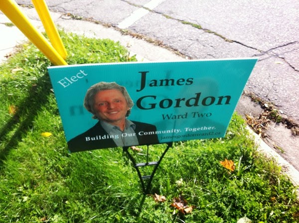 Hey, those cyan James Gordon signs were orange a few months ago! Interesting choice to use a serif font, which normally could be awkward for a sign, but it does stand out in a sea of Helvetica and Gotham and seems classy. The headshot should be larger, and the close cropping around the hair could be executed with more precision.