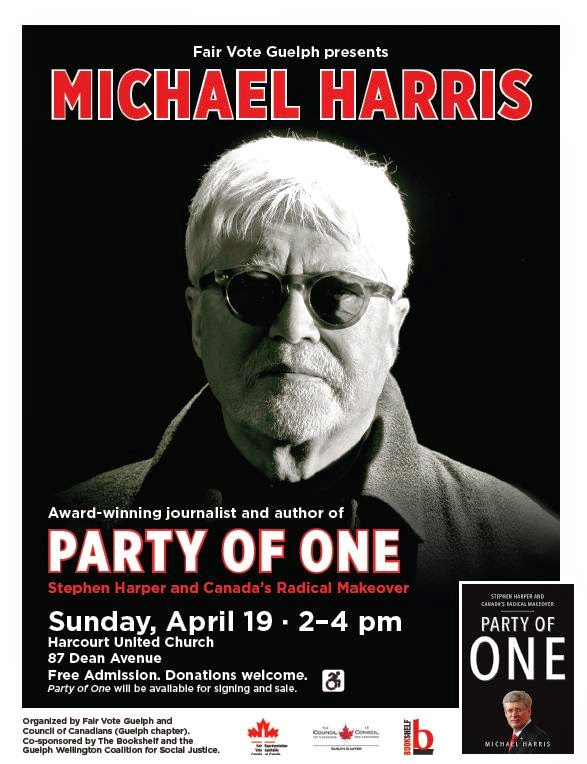 April is shaping up to be the cruelest month for Prime Minister Stephen Harper: the Mike Duffy trial begins this week, the knives are already out for the federal budget coming April 21, and author Michael Harris will be hitting the road to talk about his takedown of the Harper years, Party of One. Fair Vote Guelph is bringing Harris to the Royal City on April 19, but Open Sources Guelph will have the reporter, columnist and author on the show later this week.