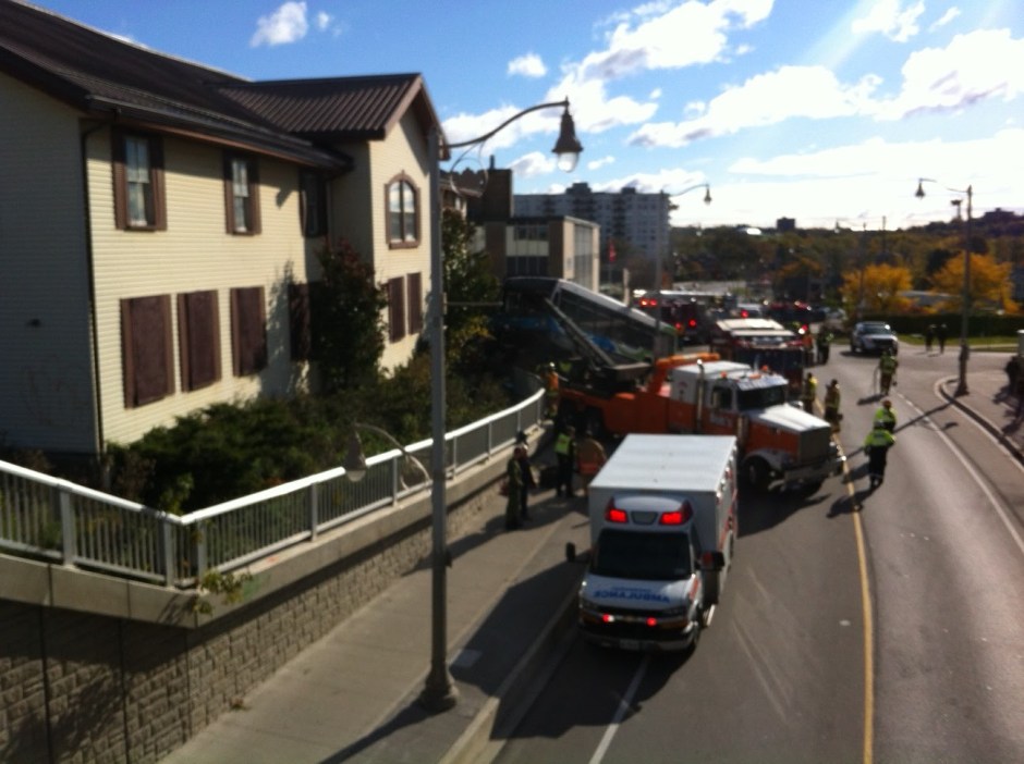On October 18, 2015 at 9:09 a.m., Guelph Police responded to a collision at the intersection of Wyndham Street South and Farquar Street. It involved a 2014 Ford Pickup truck operated by a 32-year-old female and a 2003 Guelph city bus operated by a 35-year-old Guelph male. The bus came to rest on top of the pickup truck on the berm on the east side of Wyndham Street trapping the driver of the pickup truck for over an hour. Once extricated from the truck, the driver was transported to Hamilton General hospital by air ambulance and treated for non-life threatening injuries and released. The driver of the bus was transported by GWEMS to Guelph General Hospital with non-life threatening injuries. There was one passenger on the bus that suffered minor injuries that did not require medical attention.