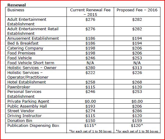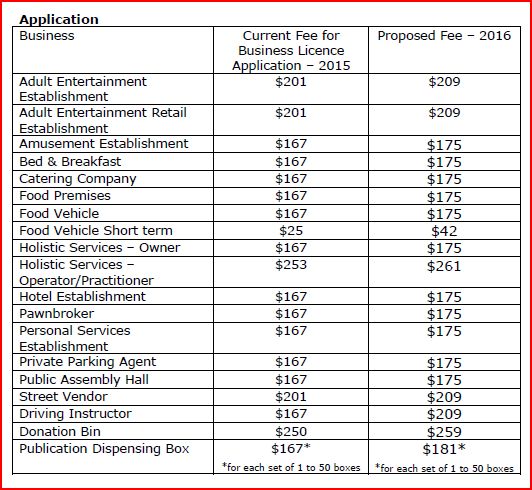 Public Services Committee, Business License Fees 2016 – Staff is recommending a fee increase of $11.60 (5.02 per cent) for new licences and $14.50 (3.95 per cent) for renewals in 2016. Business licensing fees are calculated on a cost recovery basis; therefore, no additional revenue will be realized from the proposed 2016 business licence fees. What will those look like? Look at the charts below.