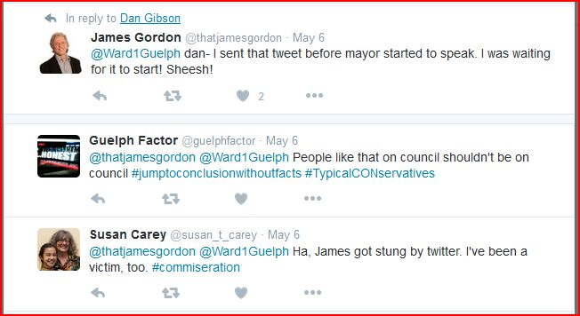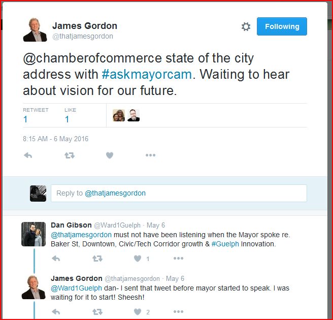 Gordon did not like the tone of some tweets that Councillor Dan Gibson said in reply to one posted by Gordon Friday while at the State of the City breakfast at the Delta Hotel and Conference Centre. But what happened in the first place? As the situation escalated quickly, there wasn’t much time to visit the background, but here’s the exchange on Twitter that became the new fiery flashpoint at tonight’s council meeting.
