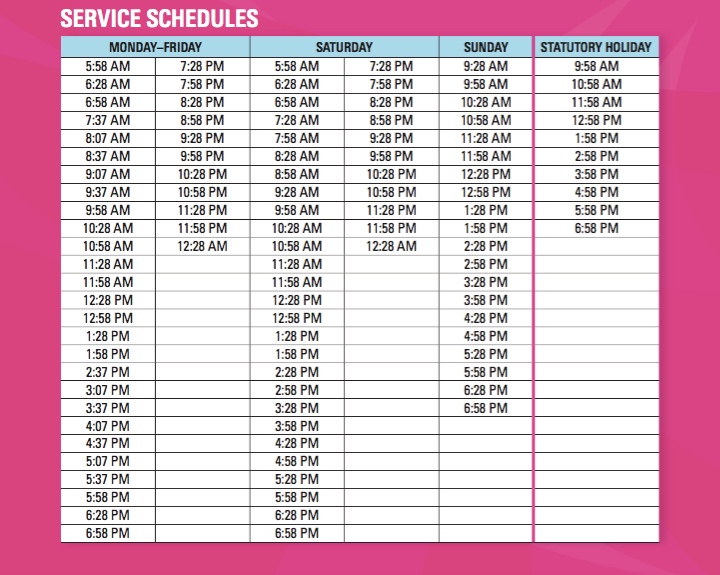 According to a supervisor I talked to Monday, the drivers were given schedules that were a kind of hybrid of the 30-minute and 40-minute schedules. While the times were correctly posted – mea culpa – there remains a situation where people were getting on the bus along with route with the expectation that they would make it downtown in time for their connections, and that was not happening. On purpose. At no point did any driver inform the bus’ passengers, until challenged, that the schedule, by design, would not be getting them downtown on time, meaning that if travelling in the usual peak time, bus riders needing transfers would have to add 30 minutes to their travel time. And it took two months to get someone to finally explain this.