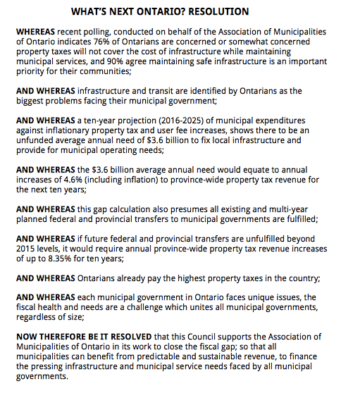 Association of Municipalities of Ontario re: Municipal Fiscal Gap – The AMO would like every council in the province to be involved in the What’s Next Ontario? project, a series of resolutions that they’re asking city and town councils to adopt as way to promote the urgency of the fiscal gap in infrastructure spanned in the province and point out that the financial mechanisms at the disposal of those councils – property taxes, user fees, and levies – are far from enough to close the whole worth billions of dollars province-wide and growing. See below, click to embiggen.