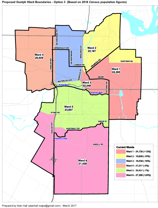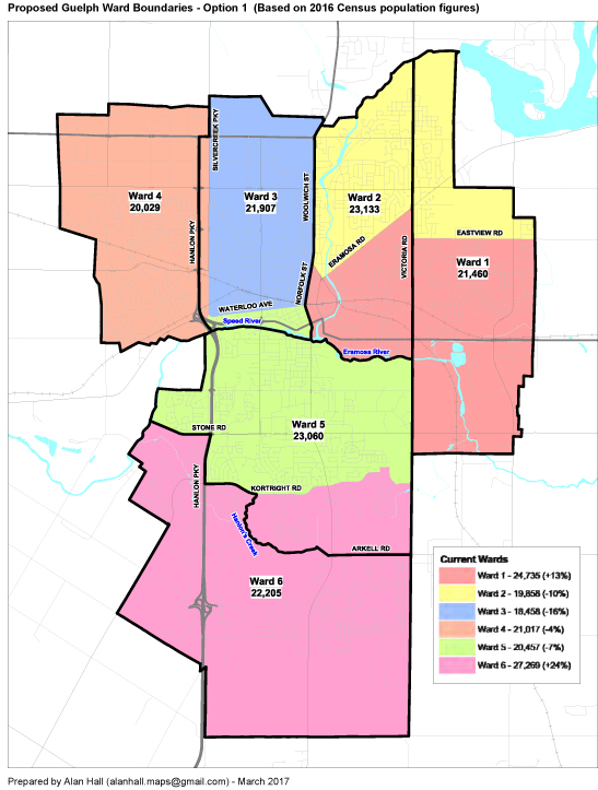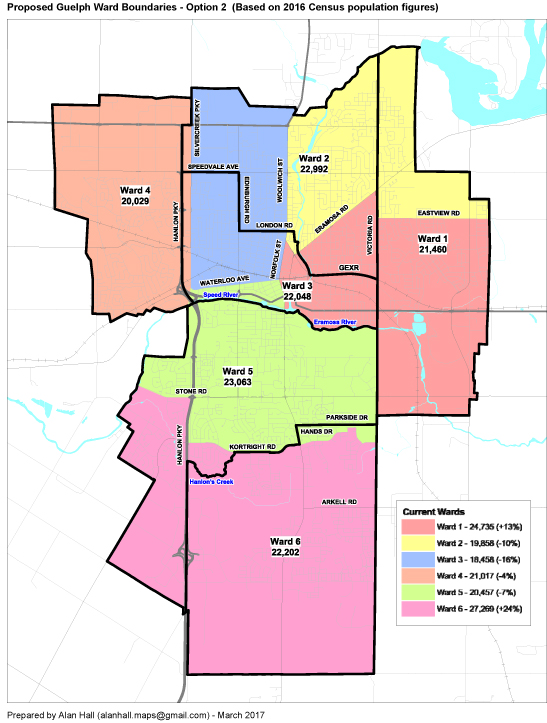 I was sent this potential redistricting proposal by Alan Hall, who used the recently released population data from the 2016 census to redraw Guelph’s ward boundary lines; the current ward configurations are in colour on the map, and Hall’s new borders are drawn in thick black lines. Obviously, the new look of the wards reflects the population booms in the east and south ends, which pushes the western boundary of Ward 1 further east, and the northern boundary of Ward 6 further south. Specifically…