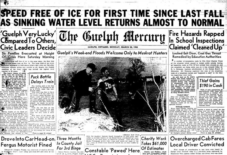 “Speed River Flood Termed Worst in 20 Years.” screamed the headline on the front of the Mercury on Saturday March 20, 1948. The last great flood of its kind happened in the Spring of 1929, but between the floods there was a World War and a Great Depression, so when the water under the Allan’s Dam reached the six-foot level, there was definitely a sense of deja vu.