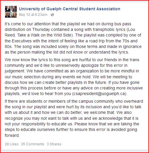 While handing out bus passes in the University Centre courtyard on Thursday May 11, the CSA did commit the crime of playing the Lou Reed song “Walk on the Wild Side.” The lyrics, which include a story about “Holly” who transforms herself from a man to a woman while traveling with the song’s narrator, were accused of being transphobic by someone or someones. The CSA issued a florid apology on Facebook, which has since been deleted, but because the internet is forever…