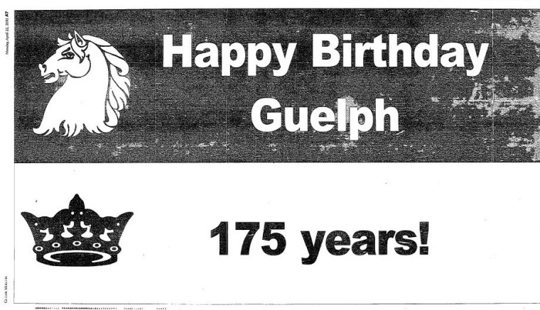 On April 20th, Joanne Shuttleworth printed a list of events for the 175th including the annual Founders Day celebration held by the Guelph Historical Society, the 175th Birthday Scholarship Fundraising Dinner at the River Run Centre, the Freedom of the City Parade, and a special Doors Open Guelph.