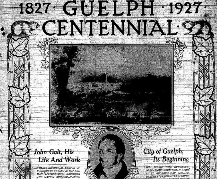 When readers got the centennial edition of the Guelph Mercury on Wednesday July 20, they were greeted with an image of two beavers standing atop twin leaf covered columns. In the centre was a view of Guelph painted in 1830 and published in Edinburgh’s Fraser’s Magazine, likely commissioned to attract newcomers to the then barely three year old City of Guelph. And underneath that was a portrait of the man who founded the Royal City itself, John Galt.