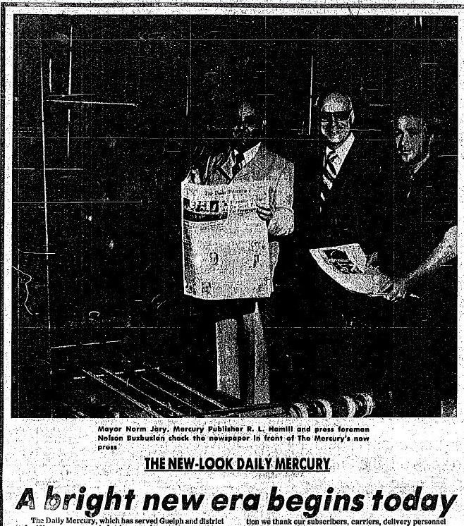 “It is most fitting that the great technological change should have been made in Guelph’s 150th anniversary year,” Hamill wrote. “The Mercury has been an integral part of the Royal City and district since the first copy came off an old horse-powered press 27 years after John Galt founded our city. Guelph and the Mercury have come a long progressive way together. Both have a bright future. We hope you will share our enthusiasm and pride on this historic occasion.”