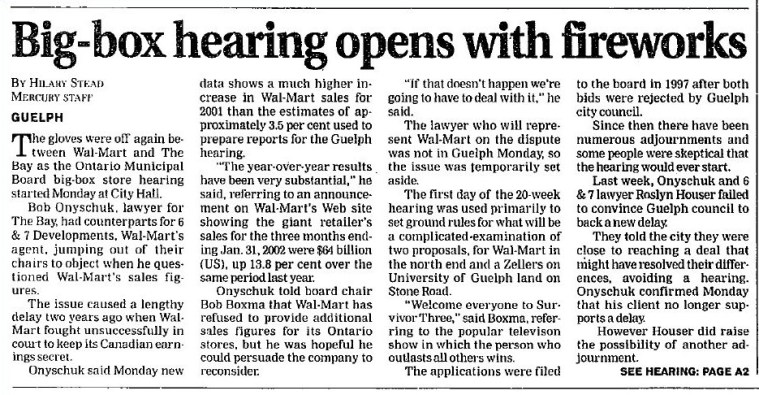 In the week leading up to the Royal City’s Dodransbicentennial, another perfectly Guelph moment was occurring with the beginning of Ontario Municipal Board hearings into the construction of the Walmart Smart Centre at the corner of Woodlawn and Woolwich. April 16 was the first day of a 20-week hearing that would dispatch the question of not just Walmart’s development in the north end, but the proposed Zellers store to be built on Stone Road in the south end on land owned by the University of Guelph. That store, you may recall, became a Walmart last year.
