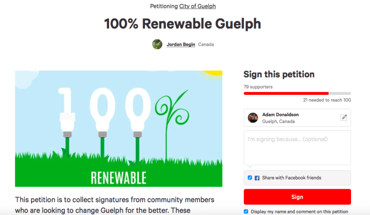 What’s It About? As one of our projects, we wanted to convince the people of city hall to commit to making a plan that would make Guelph 100% renewable. We feel it is important, as our generation will experience the greater effects of climate change and this is our future.