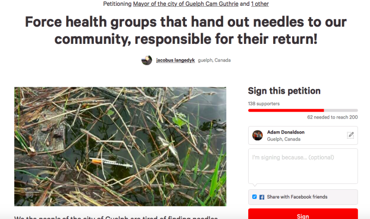 What’s It About? It is well documented how rampant the needle issue is here in Guelph as well as other drugs and we the citizen’s of Guelph want something done. Catching frogs with your kids,trail walking and fishing,or even a simple visit to the park should not be interrupted by dirty needles that put us all at risk.