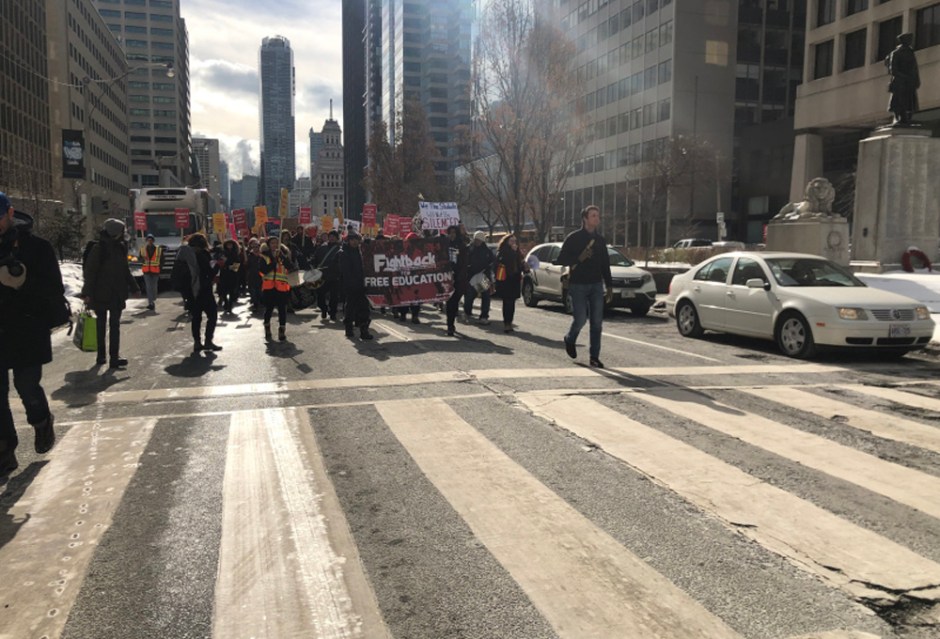 Approximately 100 students, energized with never-ending chants and enthusiastic drumming marched down Dundas St W and turned up University Ave, advancing with purpose on the Legislative Assembly.
