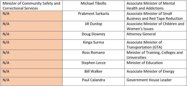 Another demotion went to Lisa MacLeod. The embattled former Minister of Children, Community and Social Services is now the Minister of Tourism, Culture and Sport, likely due to her handling of the changes to funding for autism therapies. Lisa Thompson has been made Minister of Government and Consumer Services, which is a change from her last position as Minister of Education.