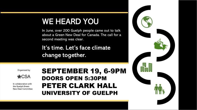 Attention New Dealers: Guelph is having another Green New Deal Town Hall on September 19 at 6 pm in Peter Clark Hall at the University Centre. This is a follow up to the town hall held in June at the Italian Canadian Club, and will be co-sponsored by the Central Student Association. “Our goal is to continue the conversation and provide opportunities to connect and act. We will have amazing speakers (more on that later) to share information and stories of action,” said the Facebook events page. To stay in the loop, and interact with other people attending, click here.