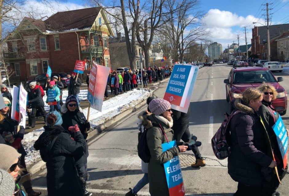 Using the sidewalks along Woolwich between Norfolk and Baker Street was tricky on Tuesday as hundreds of local elementary school teachers took part in a rotating one-day strike by the Elementary Teachers Federation of Ontario (ETFO). The second week of strike action hit the schools in the Upper Grand District Board, but it’s only the beginning of local labour strife with elementary teachers.