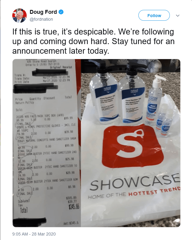 Locally, a Guelph Mercury Tribune story posted an example of price gouging at a Stone Road Mall store where a customer bought a 100 mL bottle of Zytec hand sanitizer for nearly twice the price the item is sold on the store’s website. Premier Ford even tweeted the story in a now deleted post.
