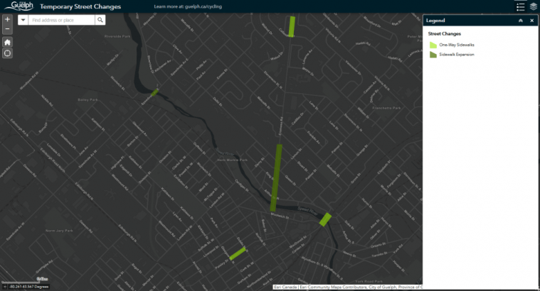Following-up on a council motion passed on May 11, the City of Guelph unveiled areas where sidewalks have been made one-way to allow for social distancing, and two areas where road lanes are being closed off for active transportation starting on June 8.