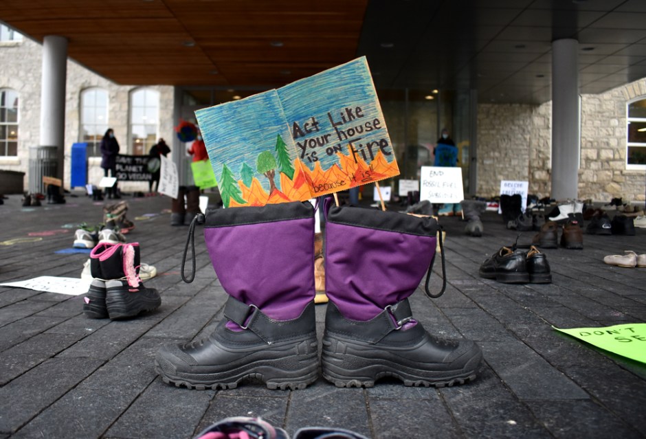 “The shoes represent the people who would otherwise be standing here at a regular Fridays for Future march, and they also represent the climate refugees who have been displaced as well, so there are a lot of different meanings here,” said Kellie Elrick, a grade 12 student at John F. Ross who was one of the handful of students at City Hall organizing the protest.