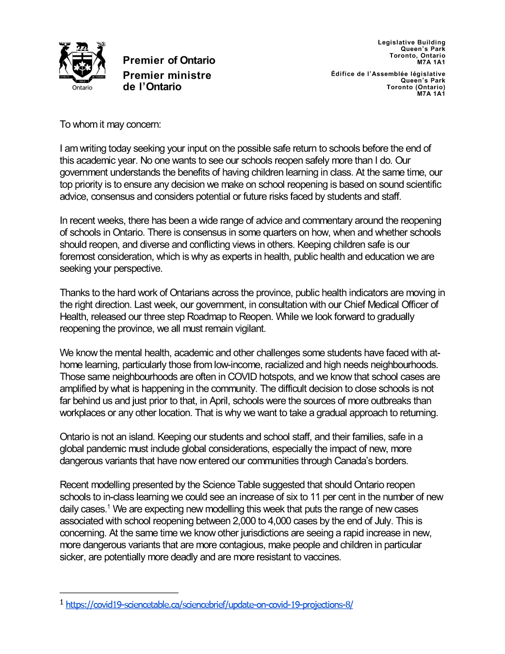 On Thursday, Ford sent a letter to 50 different scientists, doctors, and educators in search of “sound scientific advice, consensus and considers potential or future risks faced by students and staff.” The Premier wanted answers to seven specific questions including the risk to students, the risk to teachers and staff, and the growing risk of the so-called Indian variant, B.1.617, in the wake of a report from the U.K. that one dose of a vaccine is only 33 per cent effective against?