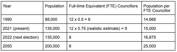 For the past 30 years or so Guelph has had 12 part-time city councillors. During that time the population of Guelph has increased from roughly 88,000 to 135,000, an almost 50 per cent increase. As such the demands on the 12 councillors have increased significantly and any councillor will tell you it is no longer a part-time commitment that is required to do the job properly. It is expected (and legislatively required by the province) that Guelph grows another 50 per cent to about 200,000 by 2050. These facts among others required the City to conduct a Council Review.