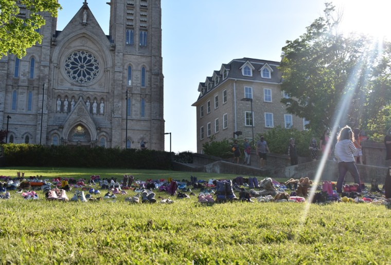 On June 1, people gathered in front of the Basilica of Our Lady here in Guelph to express their feelings about the discovery. A great sea of people shut down the intersection at Norfolk and Macdonell as local Indigenous leaders and residents led a vigil from the mezzanine overlooking the street. On the upper lawn children’s shoes were placed to symbolize all the lost lives at residential schools.