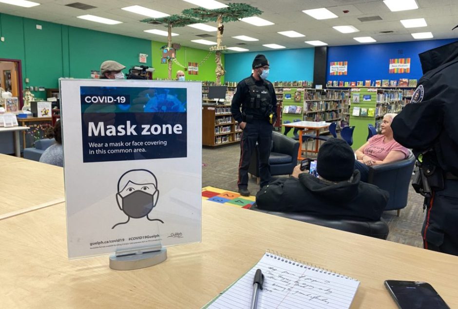 A small group of anti-mask protestors gathered at the children’s library on the second floor of the main Guelph Public Library on Thursday afternoon. The demonstration was phrased as just a regular day at the library, but the sight of eight police officers, half-a-dozen unmasked people, and a peanut gallery of a couple of reporters was anything but ordinary. Despite the high drama, the incident was largely over after 30 minutes.