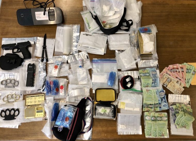 The Drug Enforcement Unit searched a vehicle and a residence after the arrests and found more than 220 grams of cocaine with a street value of $22,000, plus $2,000 cash, three sets of brass knuckles, a functioning conducted energy weapon, a butterfly-style knife and a realistic-looking pellet gun. Police took a shot of all the seized property and you can see it below. The Guelph man was released on bail and will next appear in court on February 25.