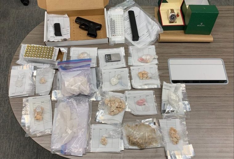 A firearm, ammunition, and a stolen vehicle were all seized from the residence, plus approximately $50,000 worth of controlled substances, which you can see below.