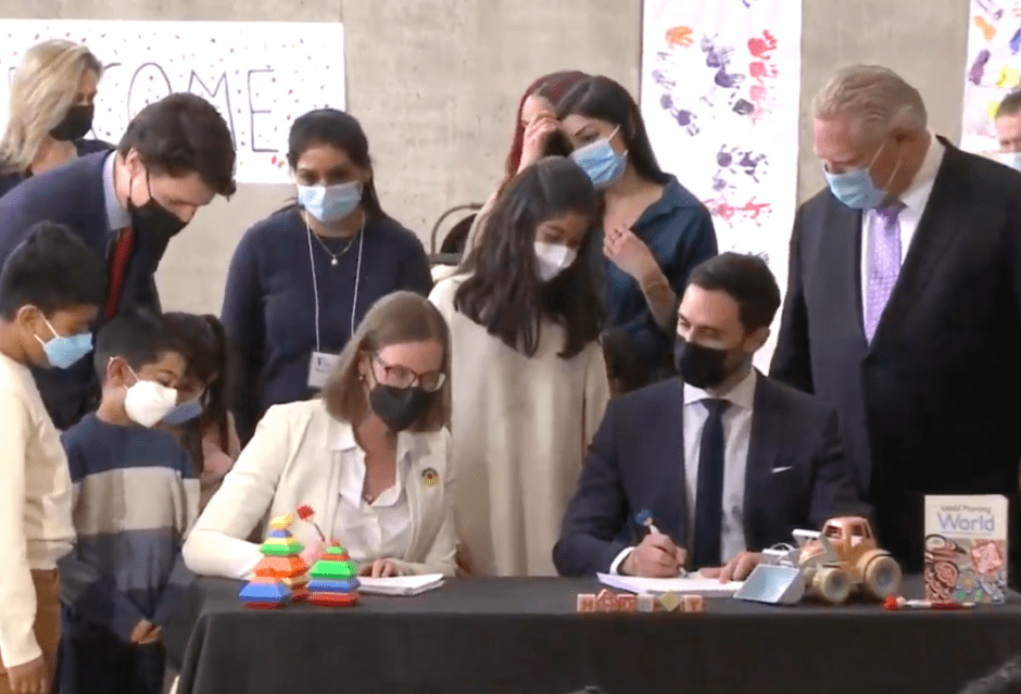It’s a clean sweep nearly a year in the making! Last, but certainly not least, Parliament Hill and Queen’s Park have finally reached a deal to provide $10 per day childcare for working parents by 2025. The $13.2 billion agreement was announced at a jubilant joint media availability at a Brampton daycare centre, as the Prime Minister, the Premier and their ministers enjoyed this “Mission: Accomplished” moment.