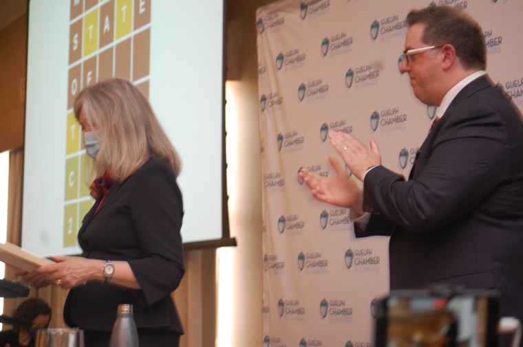 The last Wordle was very topical, “COVID.” Guthrie used the moment to honour Medical Officer of Health Dr. Nicola Mercer, who was sitting at the mayor’s table at the foot of the stage. Guthrie credited Mercer’s “brave, bold, and steady leadership” for Guelph’s success navigating the pandemic and becoming one of the most vaccinated communities in North America.