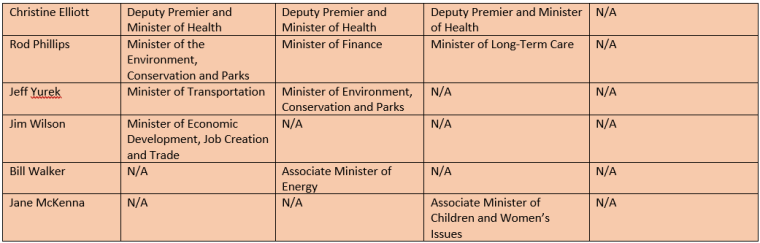 Check out the evolving picture of the Ford cabinet below. Ministers still in their previous positions are coloured light blue, ministers in the same but adjusted positions are coloured dark blue, new ministers are coloured green, previous cabinet ministers still in government are yellow, while former ministers no longer in government are orange.