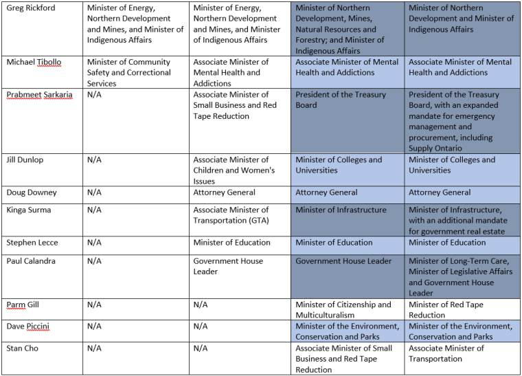Check out the evolving picture of the Ford cabinet below. Ministers still in their previous positions are coloured light blue, ministers in the same but adjusted positions are coloured dark blue, new ministers are coloured green, previous cabinet ministers still in government are yellow, while former ministers no longer in government are orange.