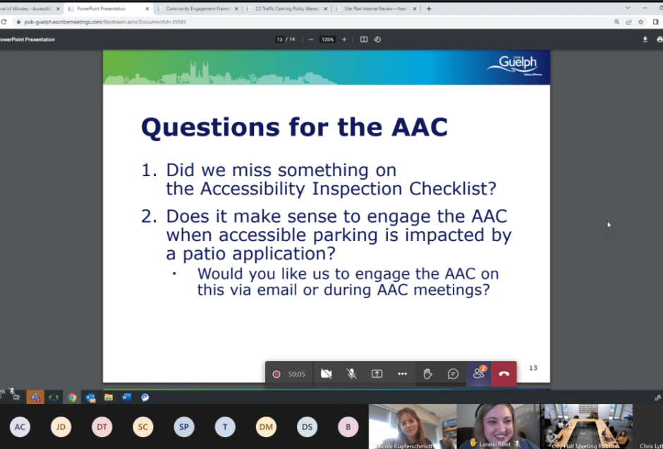 After taking their usual break in March, the Accessibility Advisory Committee got together again to talk about a myriad of different topics from the downtown patio program, to the issues around getting more playgrounds with rubber surfaces, to the more general issues around making people with disabilities feel more involved in the community engagement process. Also, we’re already counting down to Election 2026!