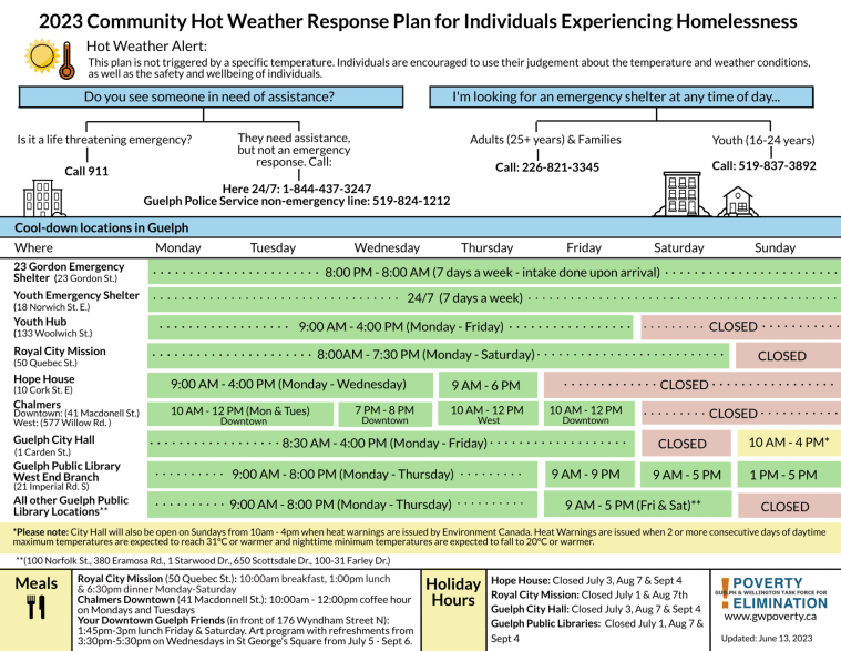 echnically, there are two plans, one for Guelph and one for Wellington County, and they each outline a protocol for the 2023 hot weather season and to support individuals experiencing homelessness by showing where they can access emergency shelters and cool-down locations. See the Guelph plan below: