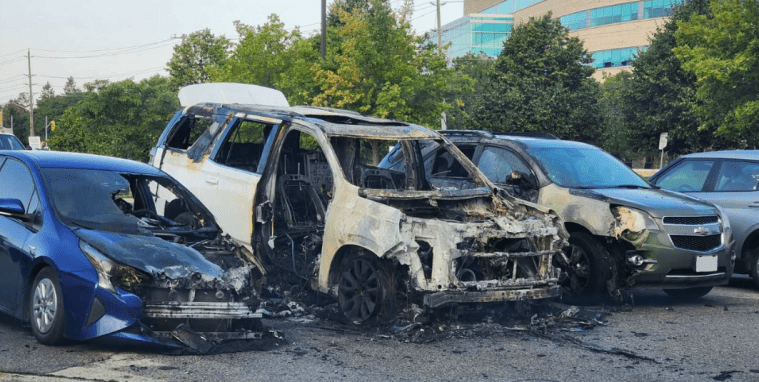 Guelph Police and Fire were called to the Delta Hotel and Conference Centre on Wednesday responding to one vehicle fully engulfed in flames and two others that were being damaged. At this time, the cause of the fire is unknown so police cannot comment on whether this fire was intentionally set. They are investigating though, and if you have any information, call Detective Constable Kyle Winters at 519-824-1212 ext. 7387 or email him at KWinters [at] guelphpolice.ca.