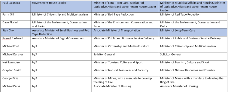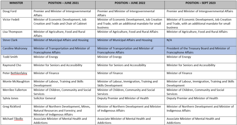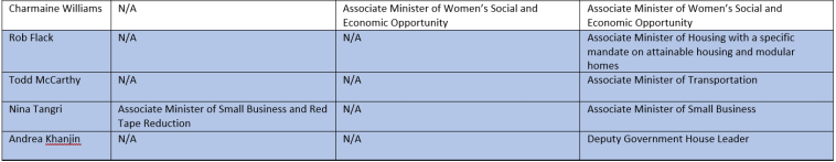 Three new faces have joined the cabinet. Elgin—Middlesex—London MPP Rob Flack is the Associate Minister of Housing with a specific mandate on attainable housing and modular homes, Durham MPP Todd McCarthy is now the Associate Minister of Transportation, and Barrie-Innisfil MPP Andrea Khanjin will serve as Deputy Government House Leader. Nina Tangri, who hasn’t been in cabinet since the new term started in June 2022, is back as Associate Minister of Small Business.