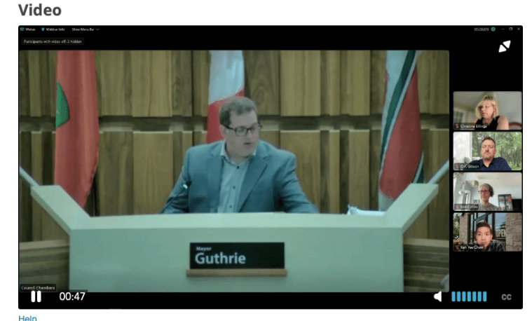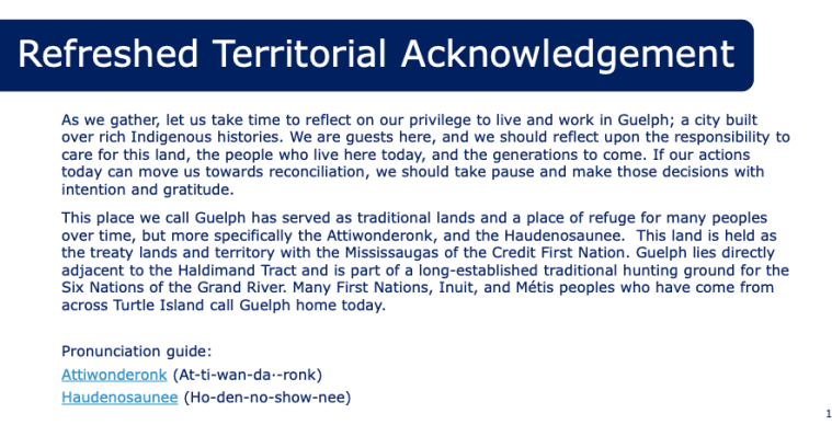 Next, a team including the Curator of Guelph Museums, the City’s Manager of Policy and Intergovernmental Relations, and the Senior Advisor for Equity, Anti-Racism and Indigenous Initiatives introduced the new territorial acknowledgement. They explained that the original acknowledgement introduced in 2016 was always intended to be a first step, and feedback from various local Indigenous groups pointed to a need to correct some pronunciation and history, while giving the acknowledgement a little more context and emotion. They also didn’t want the acknowledgement to sound like Indigenous people exist only in the past tense.