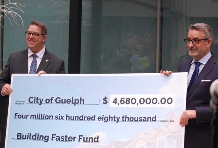 Pomp was in the air of the courtyard at Guelph City Hall Thursday morning. The special guest was Ontario’s Minister of Municipal Affairs and Housing Paul Calandra, and the order to the day was celebrating Guelph’s success on housing starts in 2023. The what was a giant novelty cheque, a symbol of the very real award for Guelph starting construction on 1,287 new housing units last year, nearly $4.7 million in “reward” money!