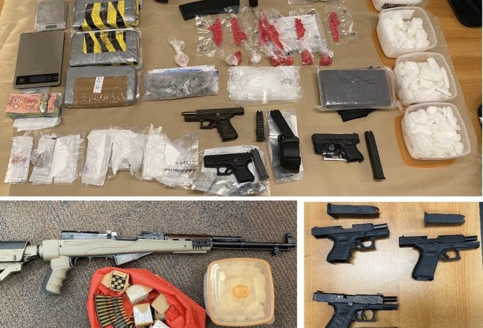A 37-year-old Brampton man faces multiple drug and firearm charges and was also arrested for violating parole along with a 68-year-old Mississauga man who was charged with multiple drug and firearm offences and a 33-year-old Hamilton man who was charged with several drug offences, all stemming from a investigation that started last November. Police recovered $4.7 million in fentanyl, the largest such seizure in Guelph Police history, and they also recovered seven kilos of meth, 3.5 kilos of highly potent fentanyl and five kilograms of cocaine, plus a variety of illegal weapons including a Kelt-Tec AR Style rifle and ammunition, and SKS semi-automatic rifle and 150 rounds of ammunition, and six Glock handguns with multiple over-capacity magazines including a 50-round drum magazine with ammunition, three of those guns were confirmed stolen from the U.S. See the picture above.