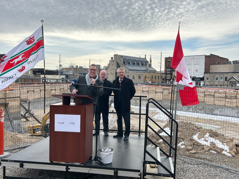 One could make an inappropriate joke about a government funding announcement in front of a giant hole in the ground, but Baker Street was only filled with the laughter that comes from joy on Monday morning. The mood was celebratory at the site of the Baker District Redevelopment, future home of Guelph’s 88,000 square-foot new main library building, which just got easier to build with a $13.5 million cheque from the federal government.