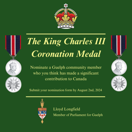 Friday August 2 is the deadline to submit a nomination for the Coronation Medal, a commemoration in honour of the Coronation of King Charles III that will be awarded to various people across Canada who have made a difference in their community. To be nominated, the person in question has to be a resident of the constituency of the current federal riding of Guelph; be alive on May 6, 2023 (you can posthumously nominate someone that died after that; and have “made a significant contribution to Canada or to a particular province, territory, region of, or community in, Canada, or attained an outstanding achievement abroad that brings credit to Canada.”