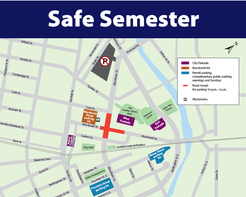 Guelph’s Safe Semester will be running again every weekend from September 5 till September 28. Macdonell Street will be closed nightly between the Macdonell parking lot and the West Parkade, and Wyndham Street will be closed between Carden Street and Cork Street on September 5, 6, 7, 13, 14, 20, 21, 27 and 28. During the closures, there is no on-street parking allowed in the closure area between 10 pm and 4 am. Residents and visitors in the area can park in the available parking lots. Any cars parked on closed streets during Safe Semester will be towed at the owner’s expense. Accessible portable washrooms will be set up at the parking lot in 28 Macdonell Street. See the map below:
