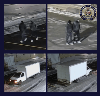 quantity of steel tubes were removed from their yard. The stolen tubes ranged from three to 12 feet in length. Surveillance video from a nearby business showed two men arriving in a white cube van at approximately 2 am on December 15. They spent nearly two hours on scene and left in the van just before 4 am. Both men appeared to be white and were wearing jackets, dark-coloured jeans, white shoes, gloves and face coverings. Anyone who recognizes the men or vehicle on the left, or has other information about the theft, is asked to call Constable Firas El-Ayoubi at 519-824-1212, ext. 7129, or email felayoubi [at] guelphpolice.ca.