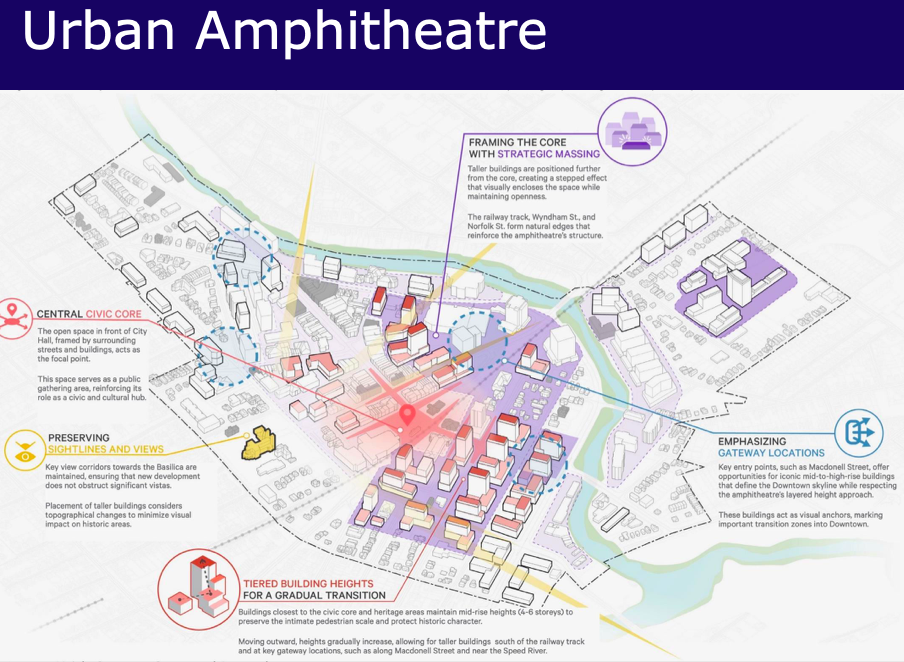 What came from the analysis is the “urban amphitheatre”, the idea that the Basilica of Our Lady sits on a stage, creating a civic core and then moving the taller buildings around that. See below:
