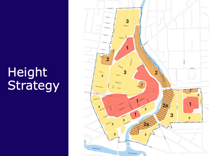 Design thinking: They looked at topography, which is unique to downtown with the slope towards the river. They looked at buffers too, a variety of boundary types like the railroad tracks and certain streets. They also looked at the clusters of heritage buildings in the main core.